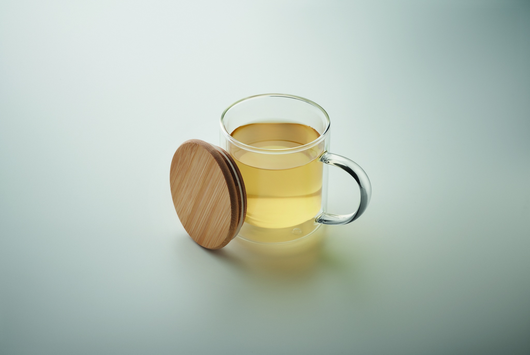 Кружка из боросиликатного стекла с двойными стенками, бамбуковой крышкой и цветной ручкой. Вместимость: 300 мл.