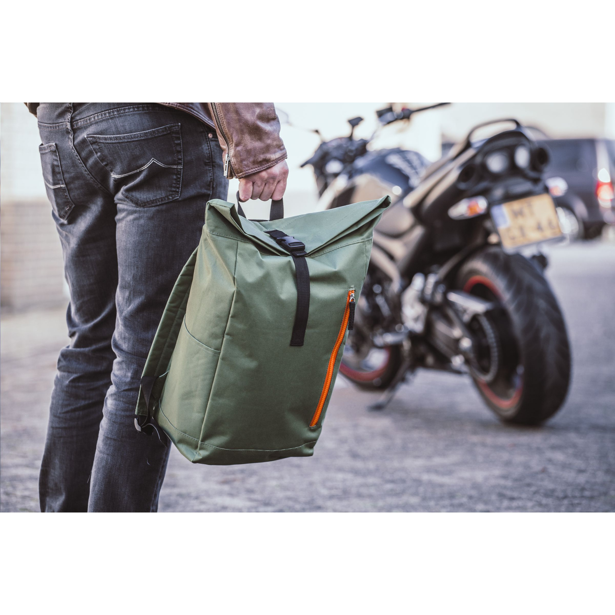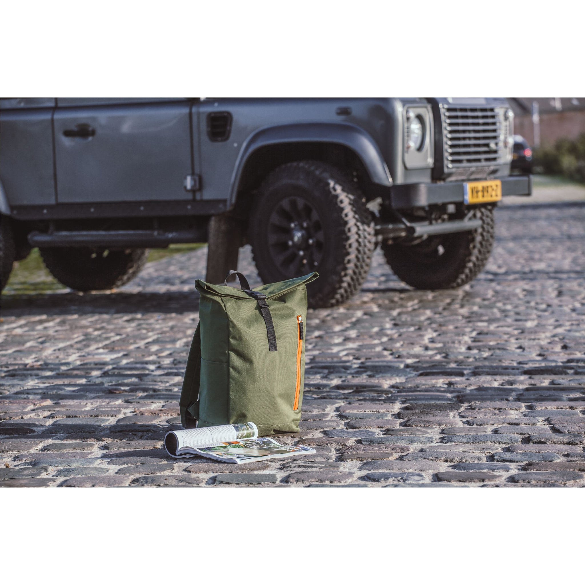 Прочный, практичный городской рюкзак с рулоном из прочного полиэстера 600D с водостойкой внутренней частью из ПВХ, частично с нейлоновой подкладкой. Рюкзак имеет одно большое внутреннее отделение, карман с обеих сторон и большой карман на молнии спереди. С пенопластовой спинкой для большего комфорта, мягкими регулируемыми плечевыми ремнями и петлей для руки. С ремнем для переноски и застежкой-рулоном с удобной системой защелкивания сверху. Идеальная сумка для повседневного использования. Вместимость около 18 литров.