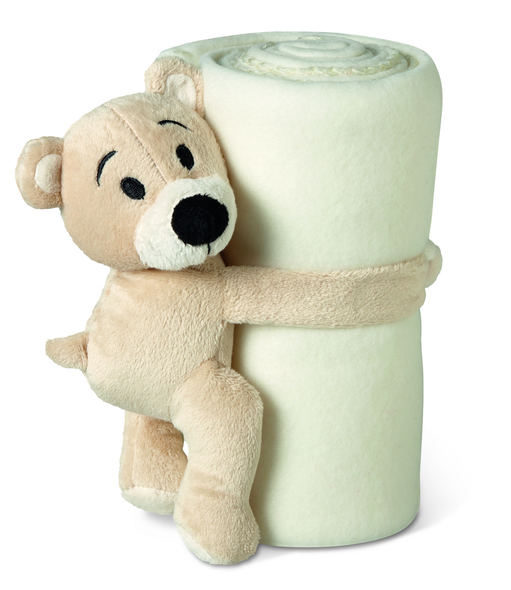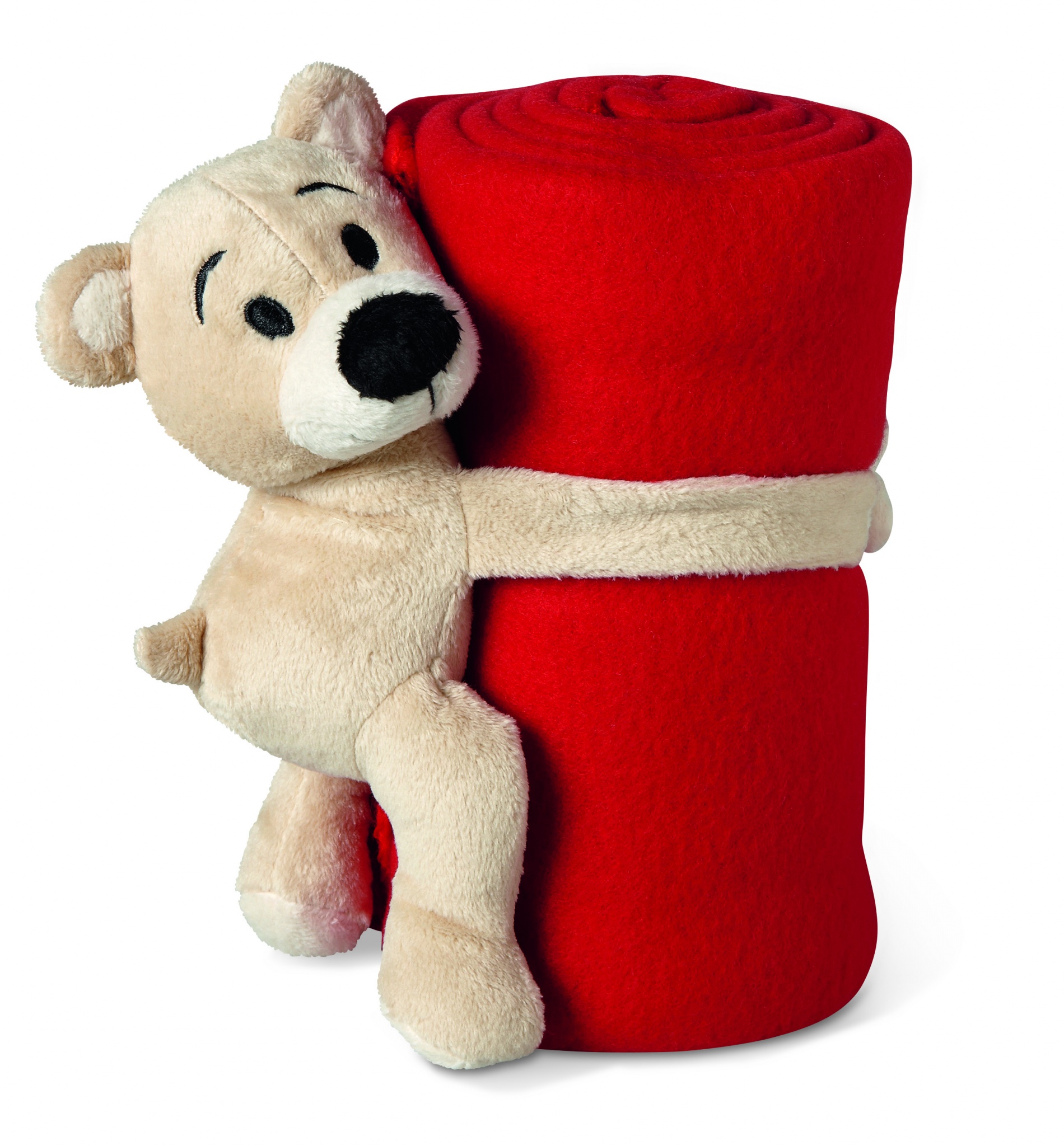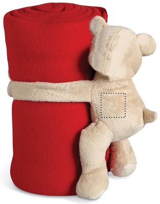 Флисовый детский плед с плюшевым мишкой, удерживающим одеяло.