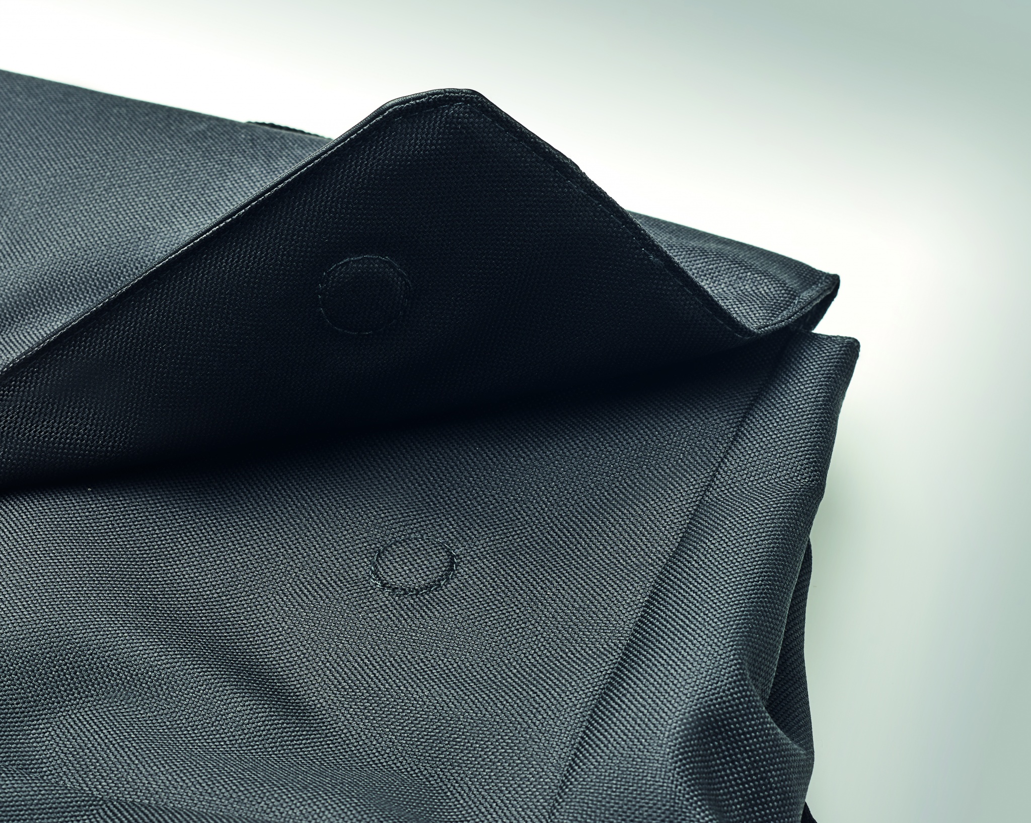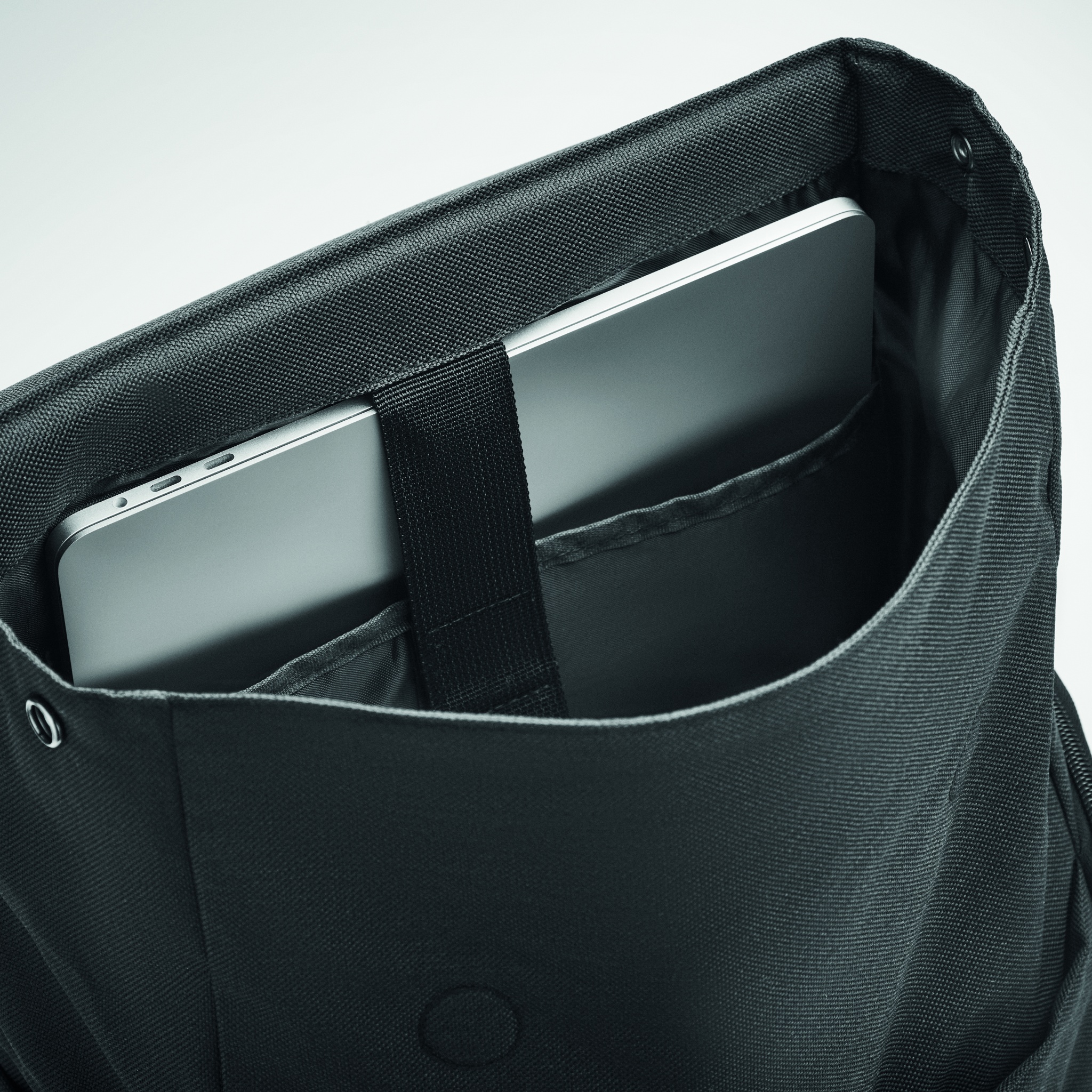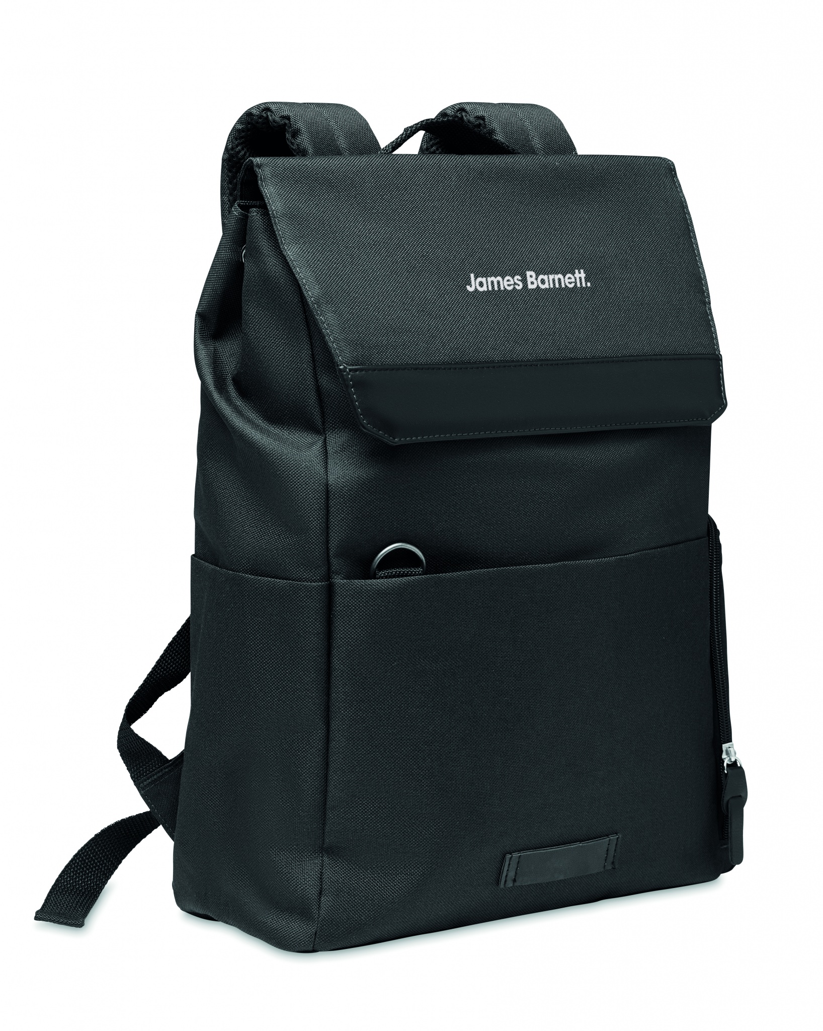 Рюкзак для ноутбука диагональю 15 дюймов из переработанного полиэтилена (RPET) 600D с магнитной застежкой. Основное отделение с мягкой прокладкой, передние карманы на молнии и 2 боковых кармана.
