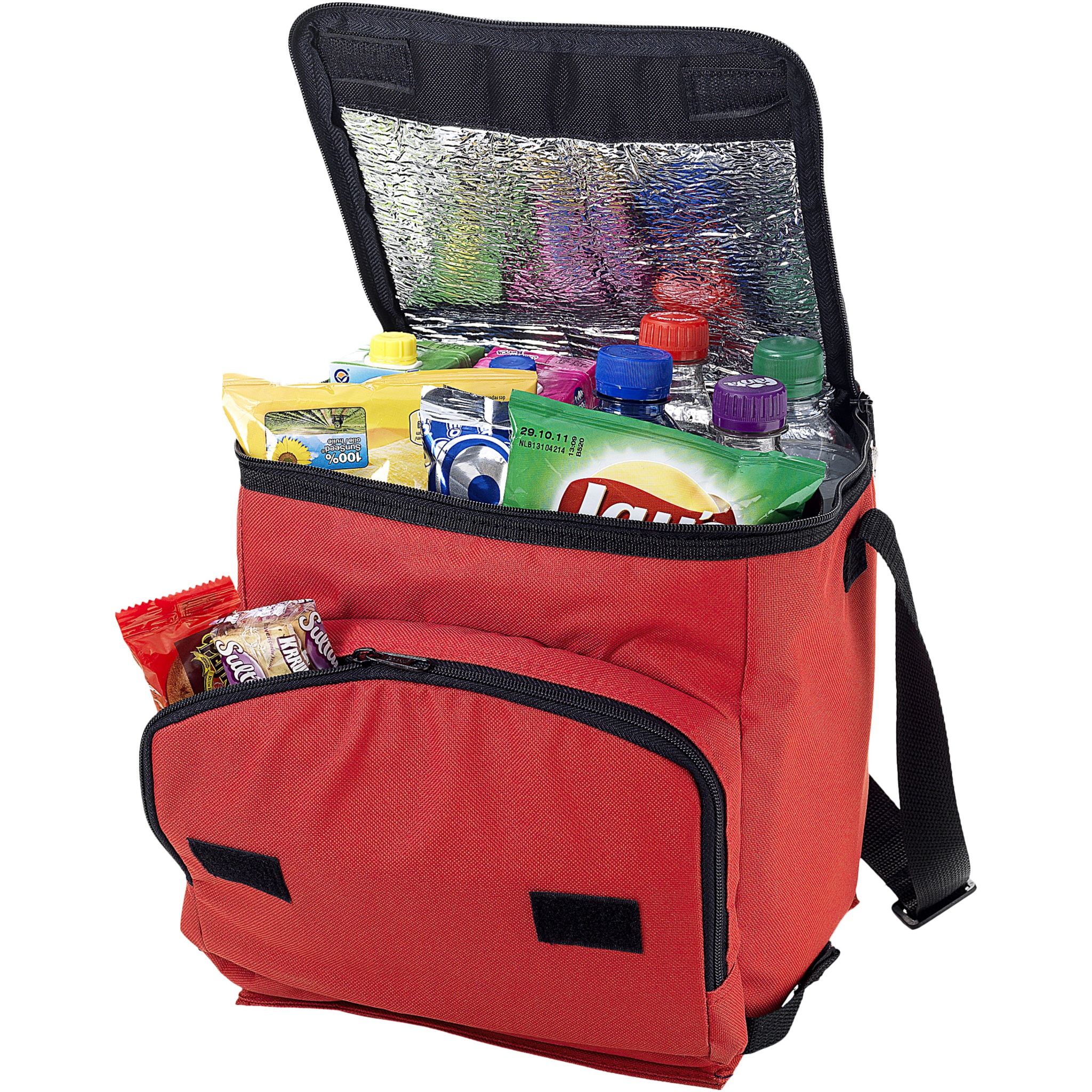 Складная сумка-холодильник с основным отделением и передним карманом на молнии. Регулируемый плечевой ремень. Сумка-холодильник складывается и закрепляется застежкой на липучке, которая находится на переднем кармане. Принадлежности не включены.