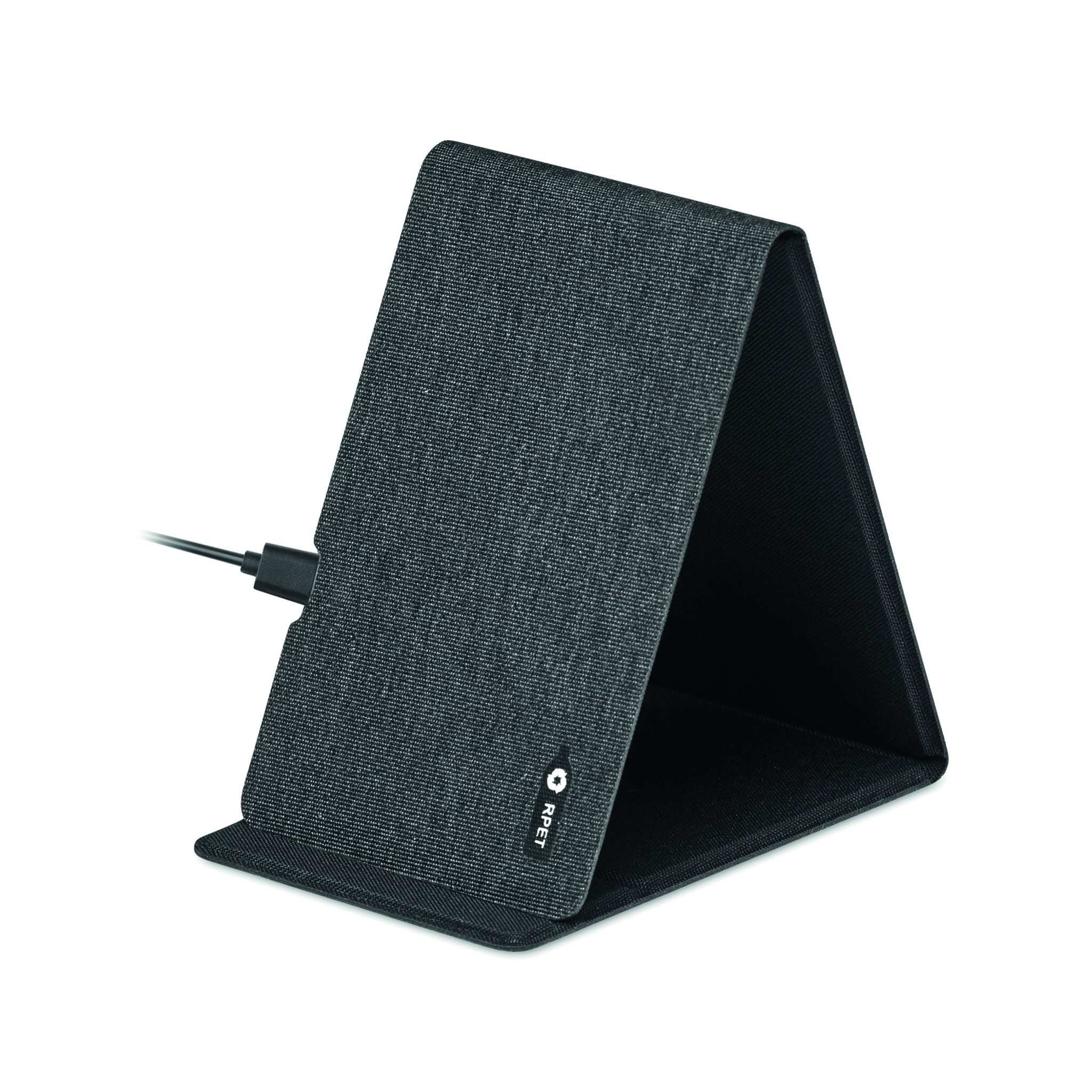 Подставка для телефона с беспроводной зарядкой на 15 Вт из RPET 300D. Выход: 9V/1.6A (15Вт) для быстрой зарядки. Совместима с последними моделями Androids, iPhone® 8 и новее.