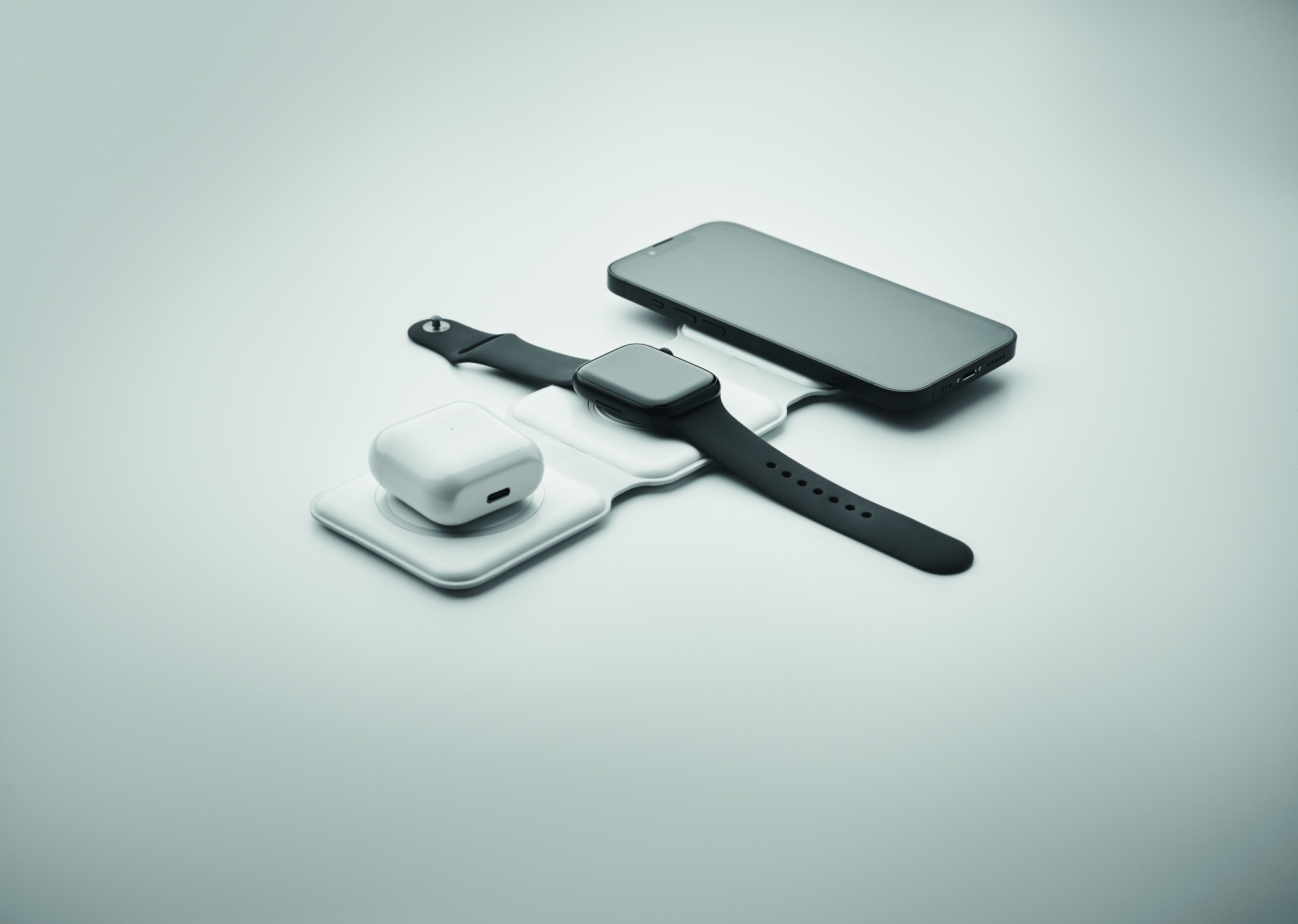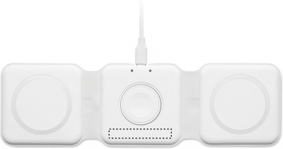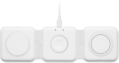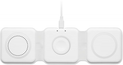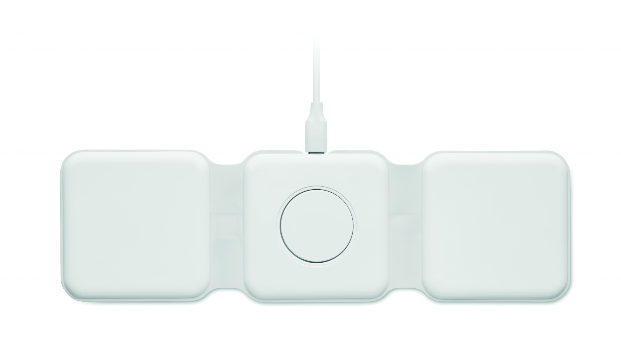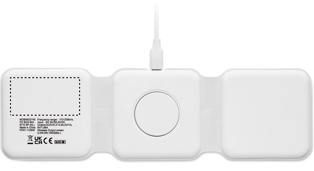 Складная пластиковая зарядная станция 3 в 1. Имеет 3 точки для беспроводной зарядки. Вход: 2-в-1 Type-C и Type-A. Совместима со всеми устройствами с поддержкой QI, такими как последние модели Android, iPhone® 8, X и более новые. Также совместима с часами iWatch.