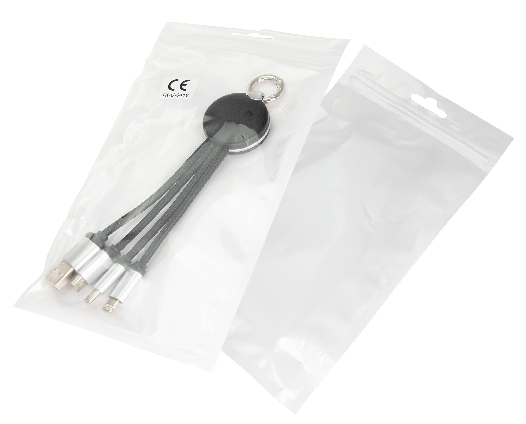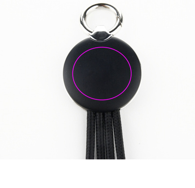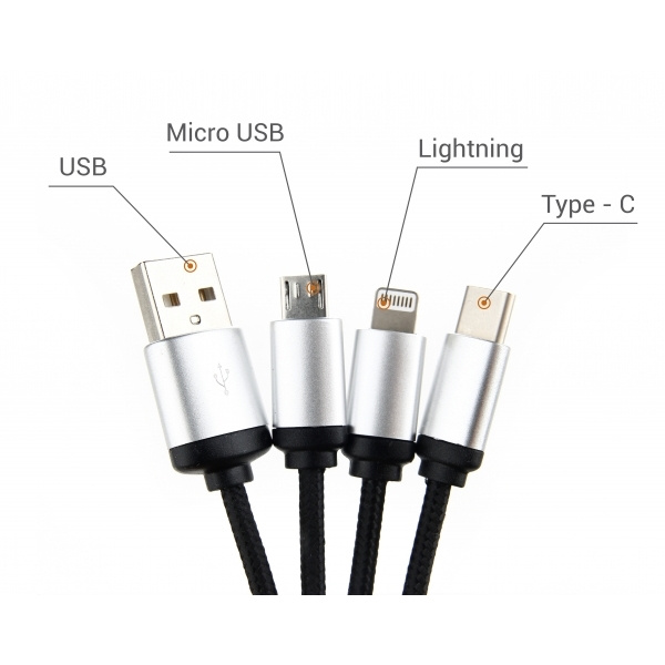 Kabel för laddning, inkluderar 3 pluggar: micro USB, lightning och typ-C. Graverad logotyp är upplyst när kabeln används.