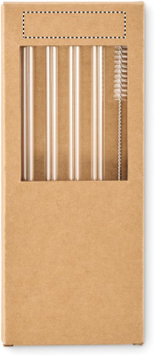 Förpackning med 4 återanvändbara sugrör i borosilikatglas med 1 rengöringsborste.