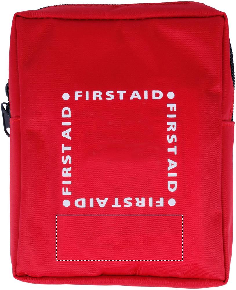 Första hjälpen kudde. Innehållande 1 st värmefilt <(>&<)> pincett, handskar, tejp och triangelformat bandage. 2 st rengöringsdukar, 4 st bandage, alkohol servetter. Långt och kort bandage och 10 bomullstussar. Pouch i 230D polyester med fästanordning på baksidan.