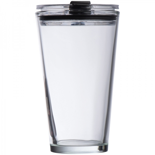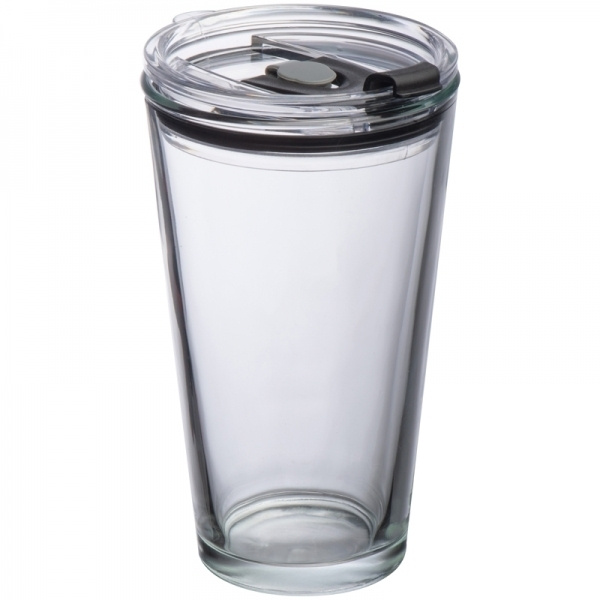 Glasmugg med läckagesäkert lock och 400ml kapacitet. Din logotyp kommer att graveras på koppen.