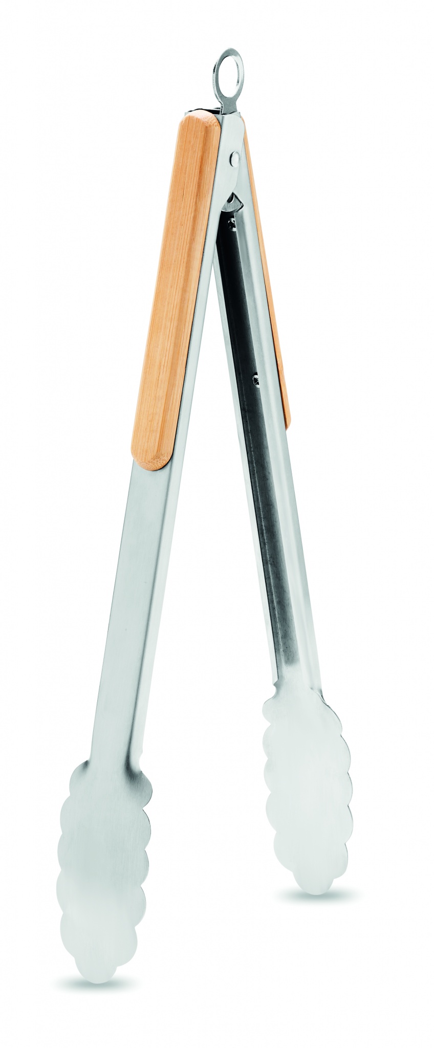 Grilltång/salladstång i rostfritt stål med bambuhandtag. Har en låsmekanism för att låsas i stängt läge för enklare förvaring