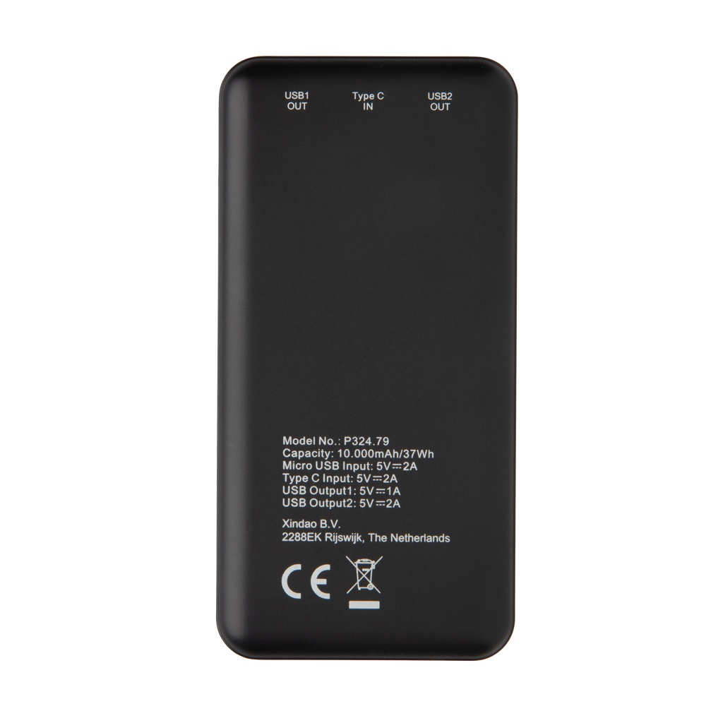 Kraftfull 10.000 mAh powerbank i fickformat, tillverkad i lättvikt ABS. När den är fulladdad kan du ladda din mobiltelefon upp till fem gånger. Powerbanken har ett långvarigt A-graderat 10.000 mAh högdensitet lithium polymer-batteri. Med dubbla USB portar. Strömindikatorn visar energinivån så att du vet när det är dags att ladda på nytt. Input 5V/2A. Type C input: 5V/2A Output USB 1: 5V/2A Output USB 2: 5V/1A