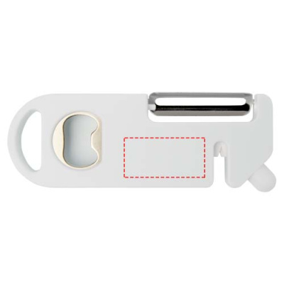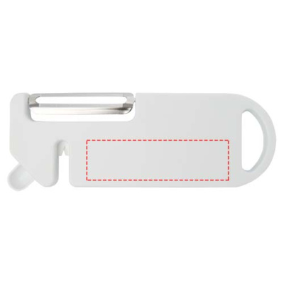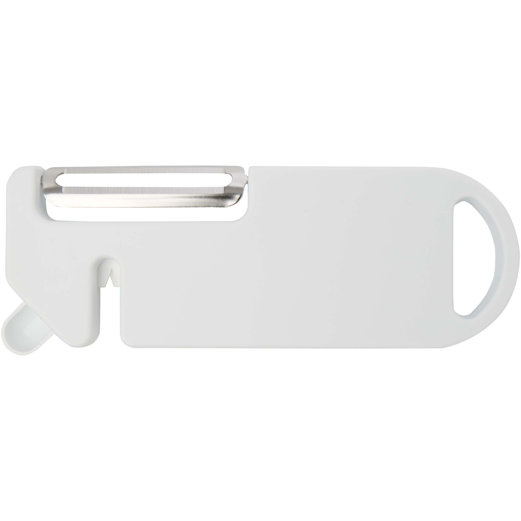 Detta mångsidiga köksverktyg kombinerar fyra viktiga funktioner i en kompakt design. Den är tillverkad av återvunnen plast och har en skalare, flasköppnare, knivslipare och en spetsig spets för att ta bort potatisfläckar. Ett inbyggt upphängningshål för enkel förvaring. Den är praktisk och utrymmesbesparande och är ett mångsidigt måste för alla kockar i hemmet.