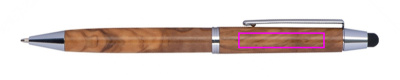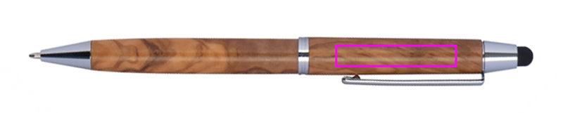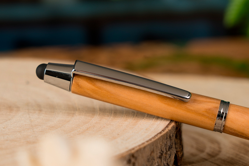 Kulpenna av olivträ, med touchfunktion och blå skrivpåfyllning. Din logotyp kommer att graveras under klämman.