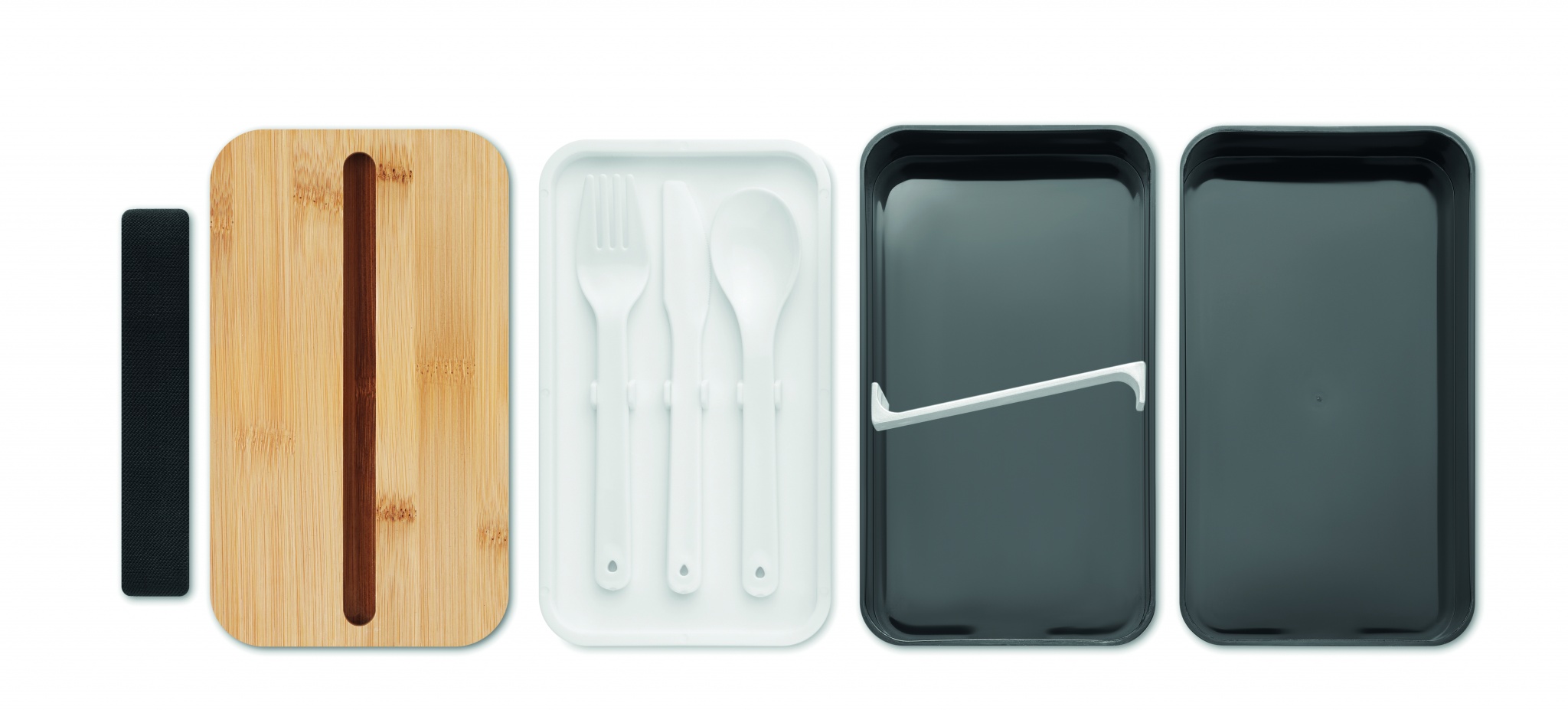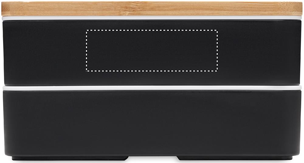 Lunchlåda av återvunnen PP i två nivåer med avtagbar avdelare och 3 bestick med fästbart polyesterband med bambulock. Locket har en funktion som telefonstativ. Kapacitet: 400 ml (2x).