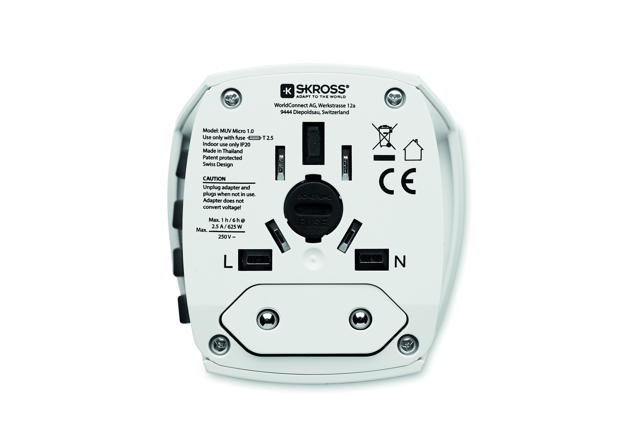 Universell reseadapter från SKROSS för Europa, USA / Japan, Australien / Kina. 2-polig (ej jordad kontakt). Uppfyller alla internationella säkerhetsrelevanta standarder och normer. Även barnsäker.