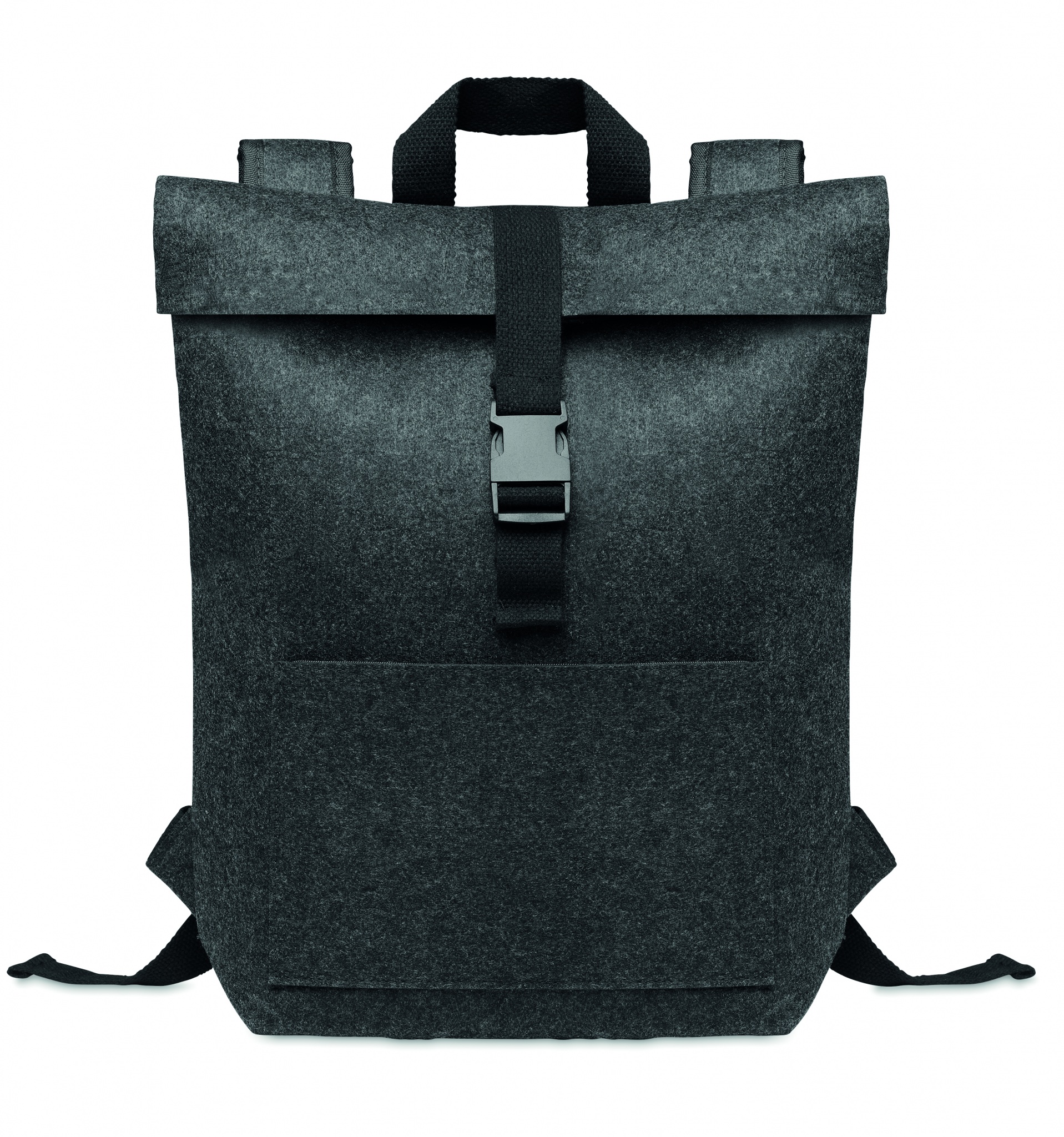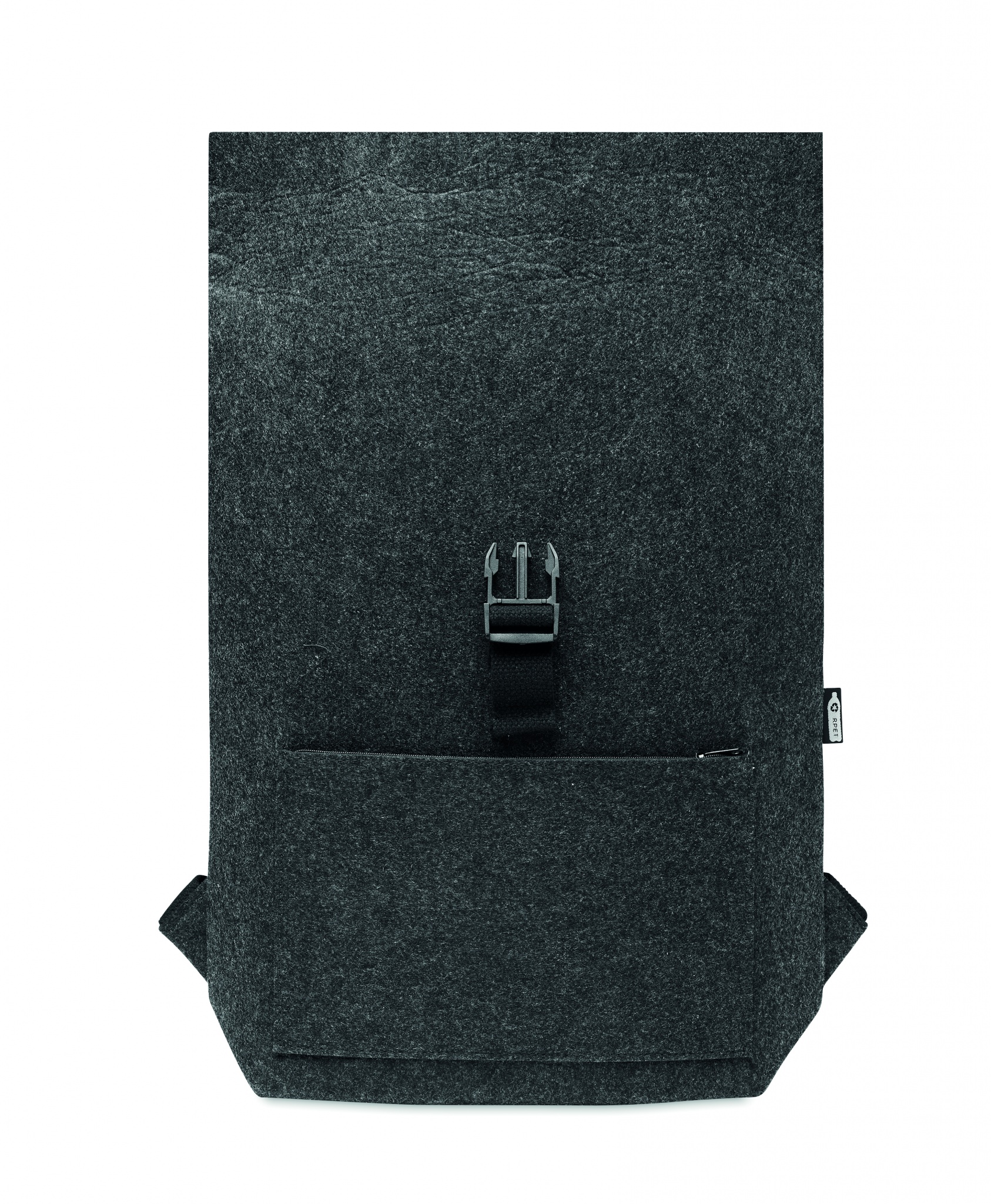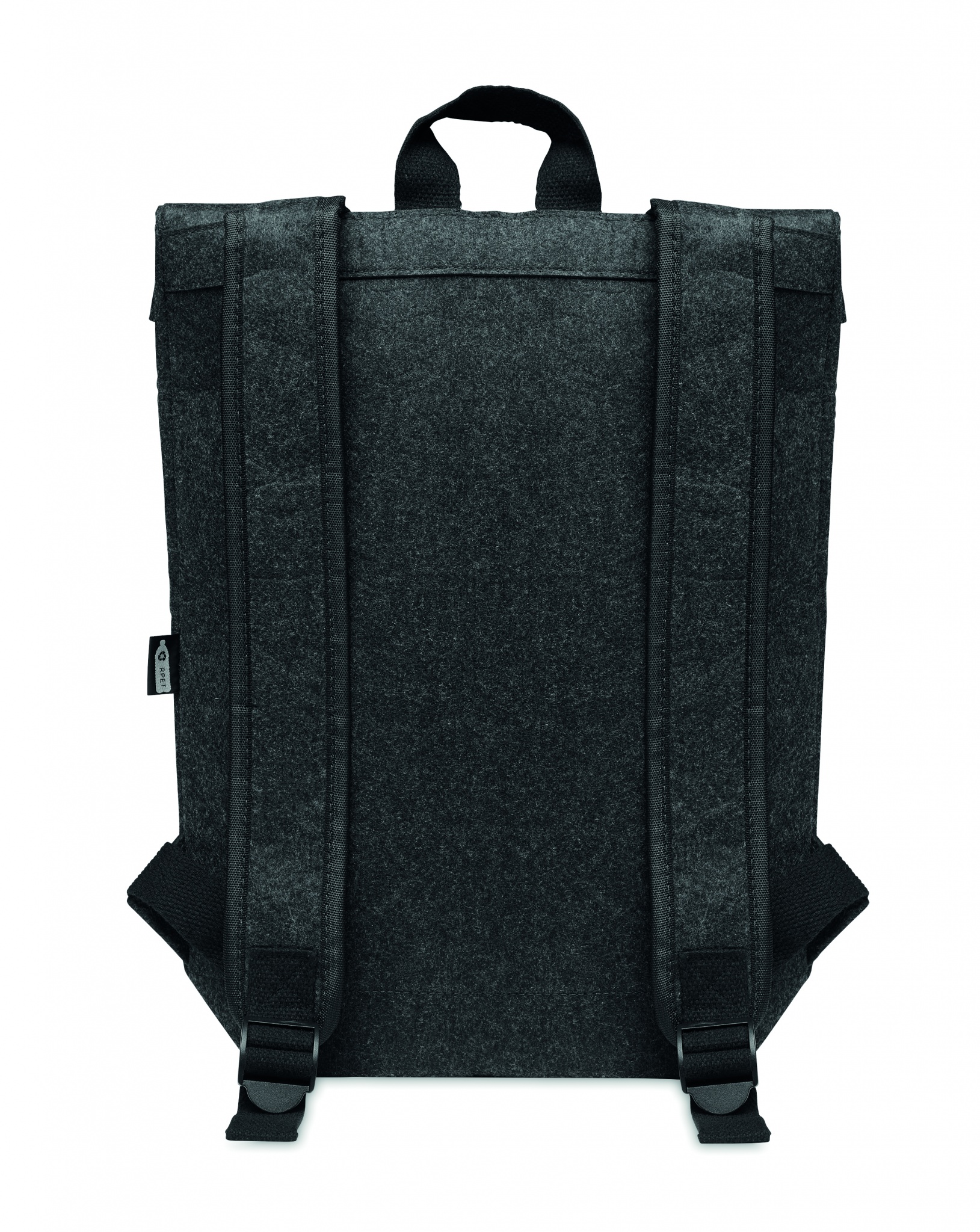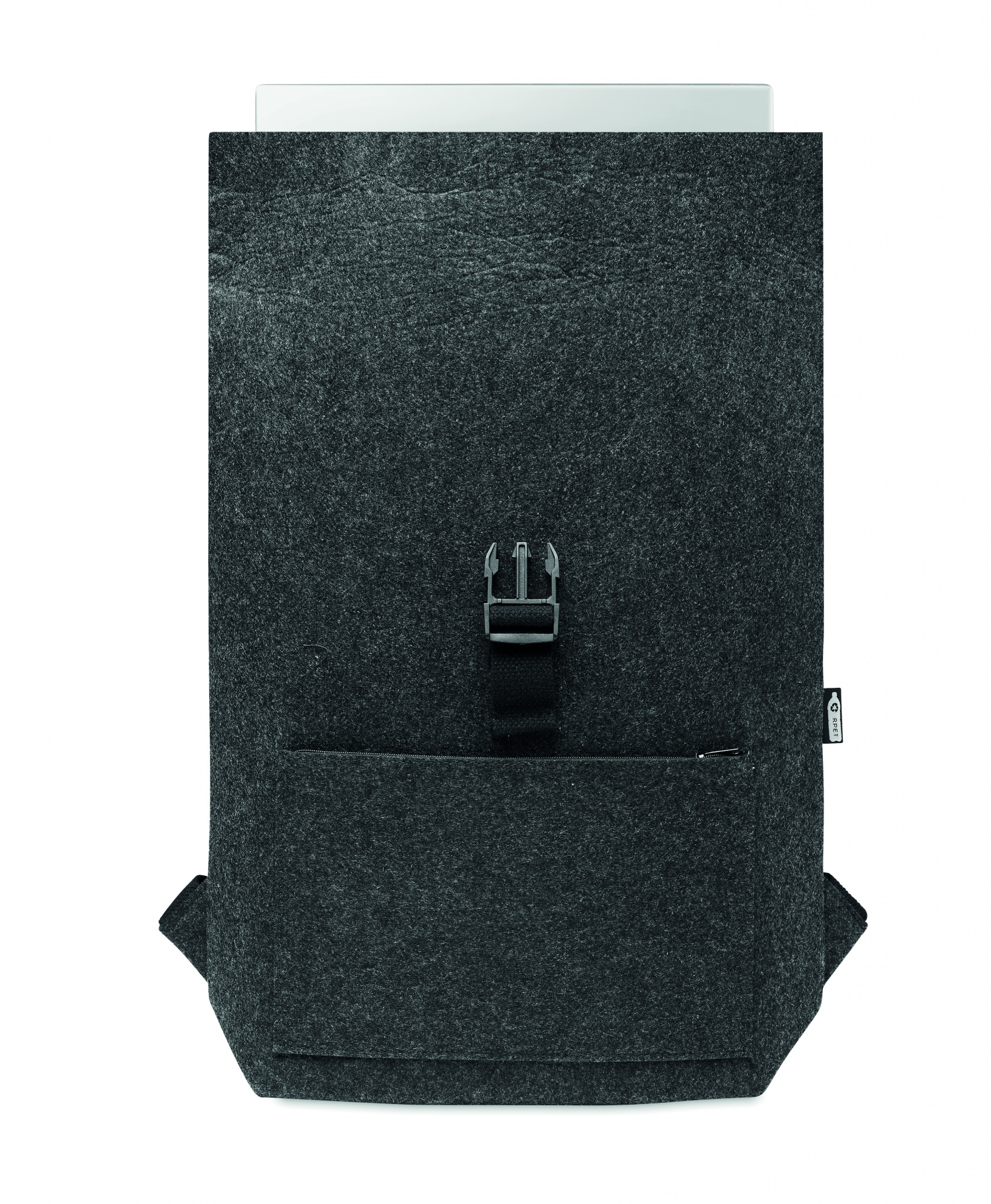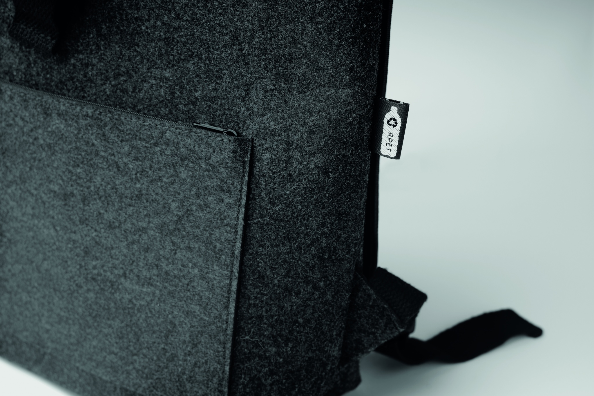 Ryggsäck av RPET-filt med bomullsrem och ficka med dragkedja på framsidan. Den har ett fack för bärbar dator.