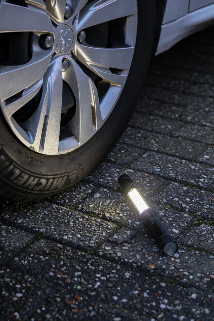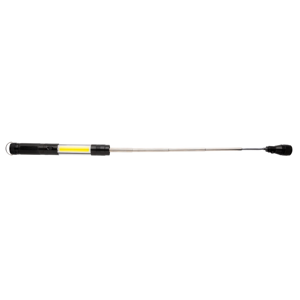 Perfekt arbetslampa, denna dubbelt magnetiska LED arbetslampan kan fästas på alla metallytor för optimal belysning. Lampan kan förlängas från sin normala storlek på 26 cm till 64 cm vilket möjliggör att du kan få tag i föremål som är svåra att nå och se med hjälp av magneten på fronten. Lampan har 3 LED 10 l för extra stark belysning och 80 lumen COB lampa. När lampan förlängs blir huvudet flexibelt och kan justeras i alla riktningar. Levereras inkl. batterier.