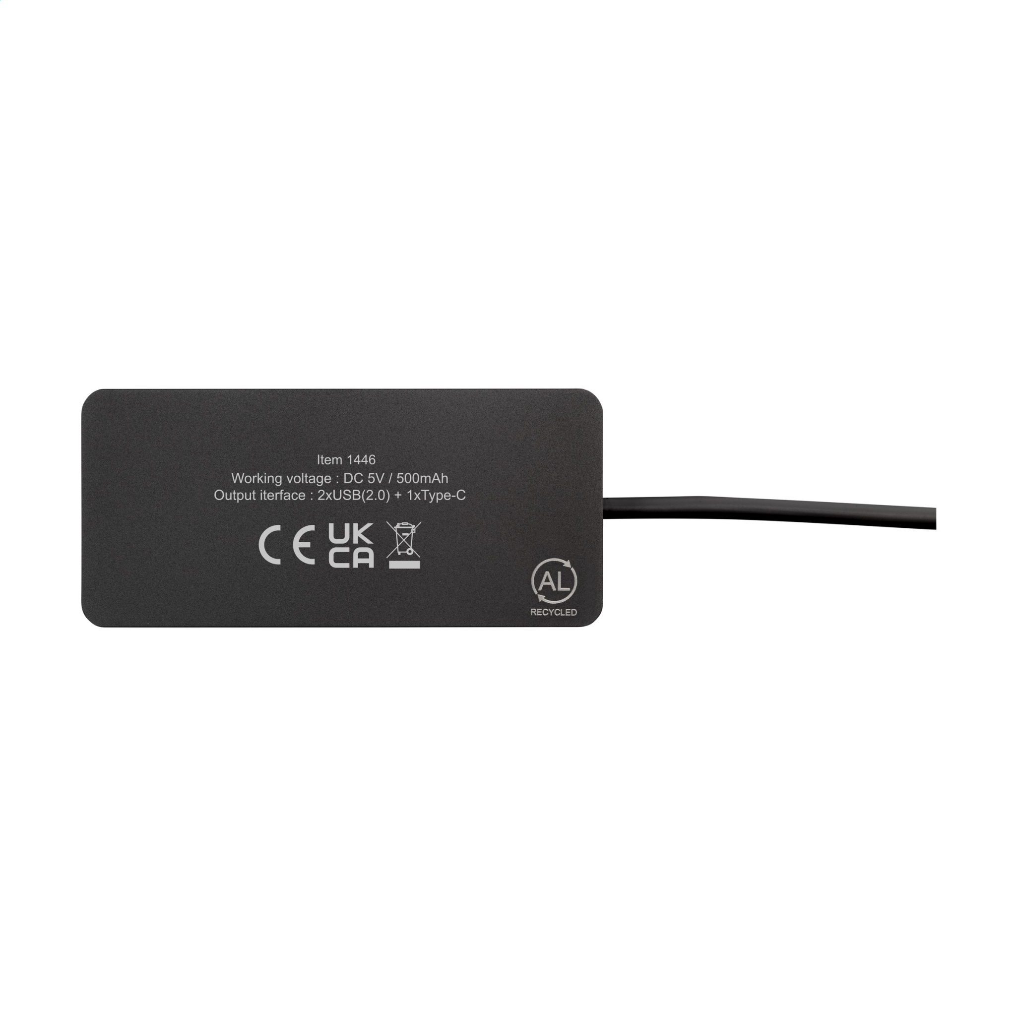 Kompakt, lätt 2.0 USB-hubb. Höljet är tillverkat av 100 % GRS-certifierat återvunnet aluminium. Utrustad med 3 USB-portar: 1 USB-A 2.0-port och 2 Type-C-portar för anslutning av ytterligare enheter. Levereras med matchande svart kabel med en dubbel ingångskontakt, lämplig för både typ-c och USB-A-datorer. Totalt återvunnet material: 50 %. Genom att använda återvunnet aluminium används färre nya råvaror vid tillverkningen av denna produkt. Det innebär mindre energiförbrukning och mindre användning av vatten. Ett ansvarsfullt val. Varje artikel är individuellt förpackad.