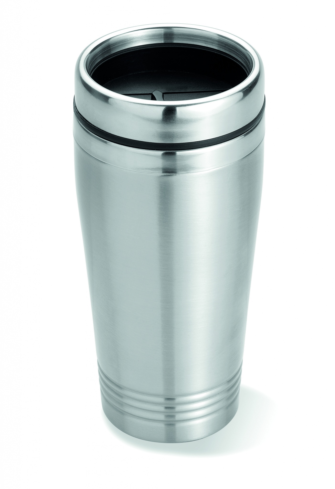 Take away mugg med dubbelvägg i rostfritt stål. Lock i svart PP med glidlock som täcker öppningen för att hålla värmen bättre. Volym: 400ml.